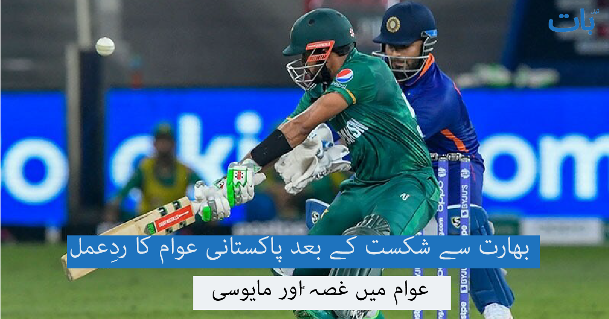 پاکستانی عوام بھارت کے خلاف شکست پر مایوسی اور غصے کے ملے جلے جذبات کا اظہار کر رہے ہیں۔ سوشل میڈیا، نجی محفلوں اور عوامی مقامات پر اس ہار پر شدید ردِعمل سامنے آ رہا ہے۔پاکستانی عوام بھارت کے خلاف شکست پر افسوس کر رہے ہیں۔ لوگ ٹیم کی ناقص کارکردگی پر مایوس ہیں اور سمجھتے ہیں کہ یہ میچ جیتا جا سکتا تھا۔ شائقین کرکٹ، جو بڑی امیدوں کے ساتھ میچ دیکھتے ہیں، وہ اب دل برداشتہ نظر آتے ہیں۔ سوشل میڈیا پر عوام اپنی ناراضی اور افسوس کا اظہار مختلف انداز میں کر رہے ہیں۔ یہ صورتحال ظاہر کرتی ہے کہ پاکستانی عوام کرکٹ کو صرف تفریح نہیں بلکہ قومی جذبات سے جڑی ایک سنجیدہ چیز سمجھتے ہیں۔